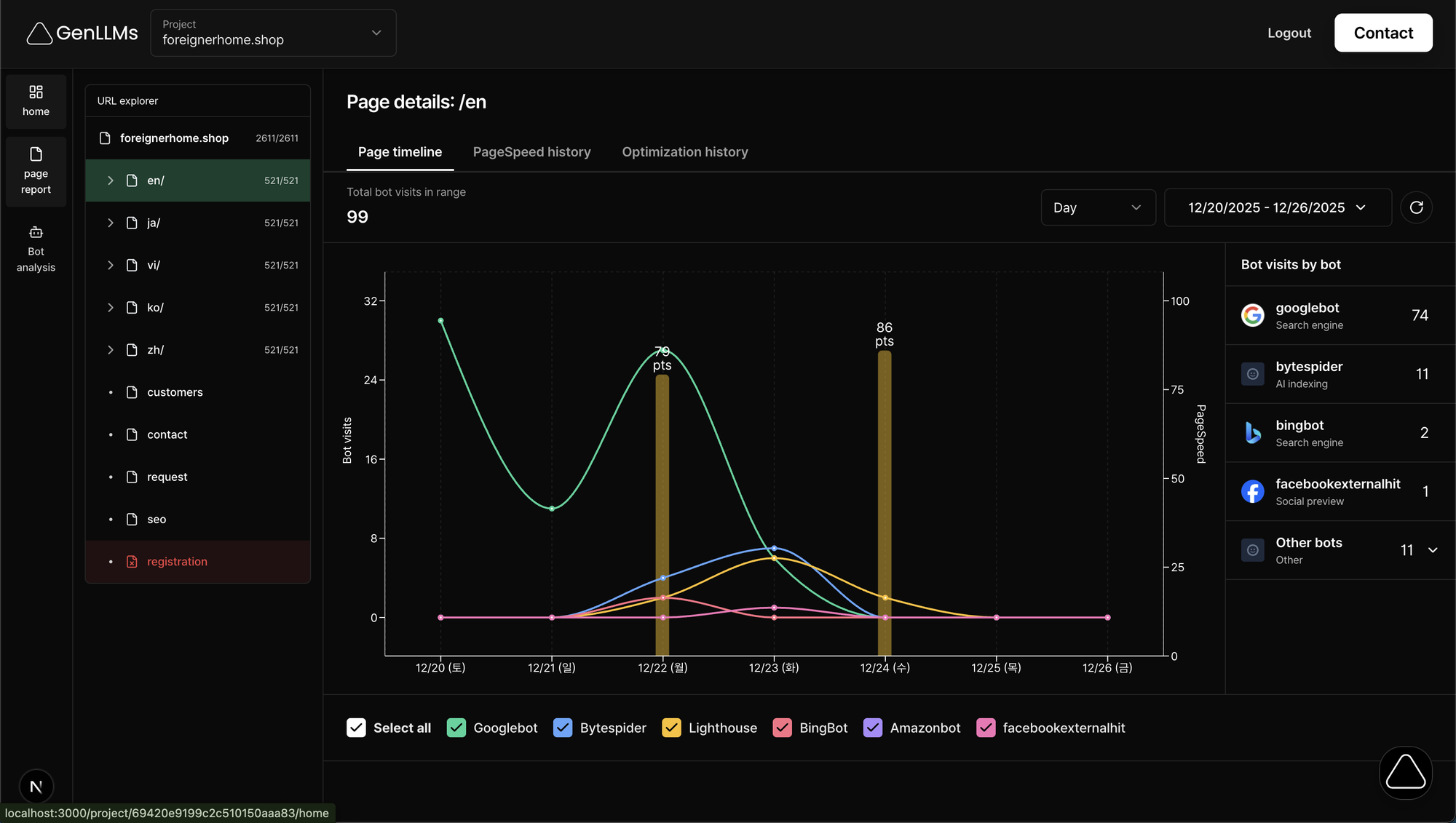The platform creates bot-first pages—structures specifically designed for AI agent readability. Automatic schema generation produces valid JSON-LD markup without manual coding. Every bot interaction gets logged, giving you full bot log visibility to see exactly what crawlers encounter when they hit your pages.